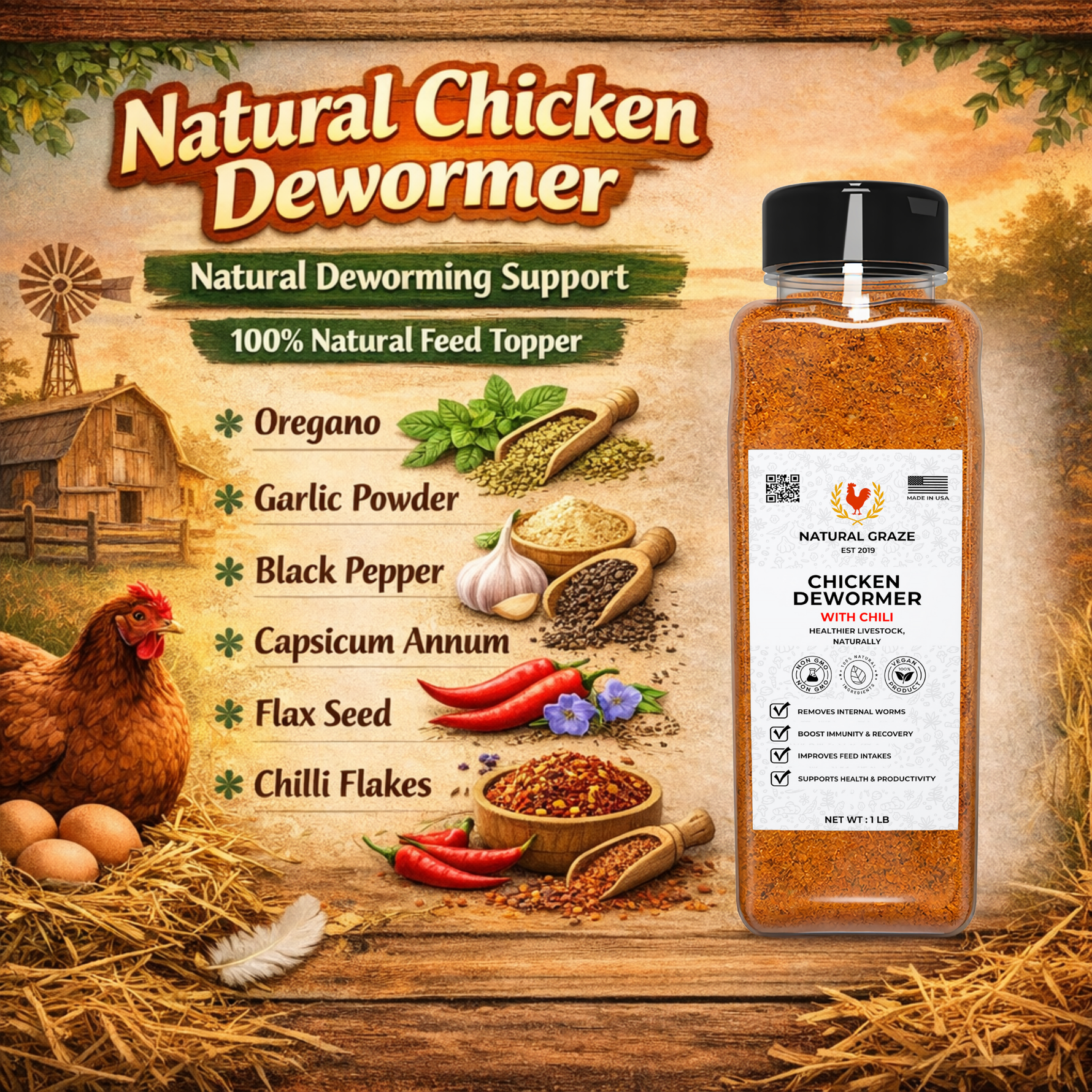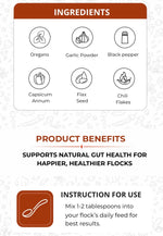 Natural Graze Chicken Dewormer is a natural daily supplement formulated to help maintain a gut environment that’s unfavorable to internal parasites while supporting overall digestive health. Made with oregano, garlic powder, black pepper, capsicum annuum, flax seed, and chili flakes, this powerful botanical blend supports gut balance, natural defenses, and healthy digestion. Designed for regular use, it works alongside your flock’s routine to help keep chickens active, resilient, and thriving—naturally.